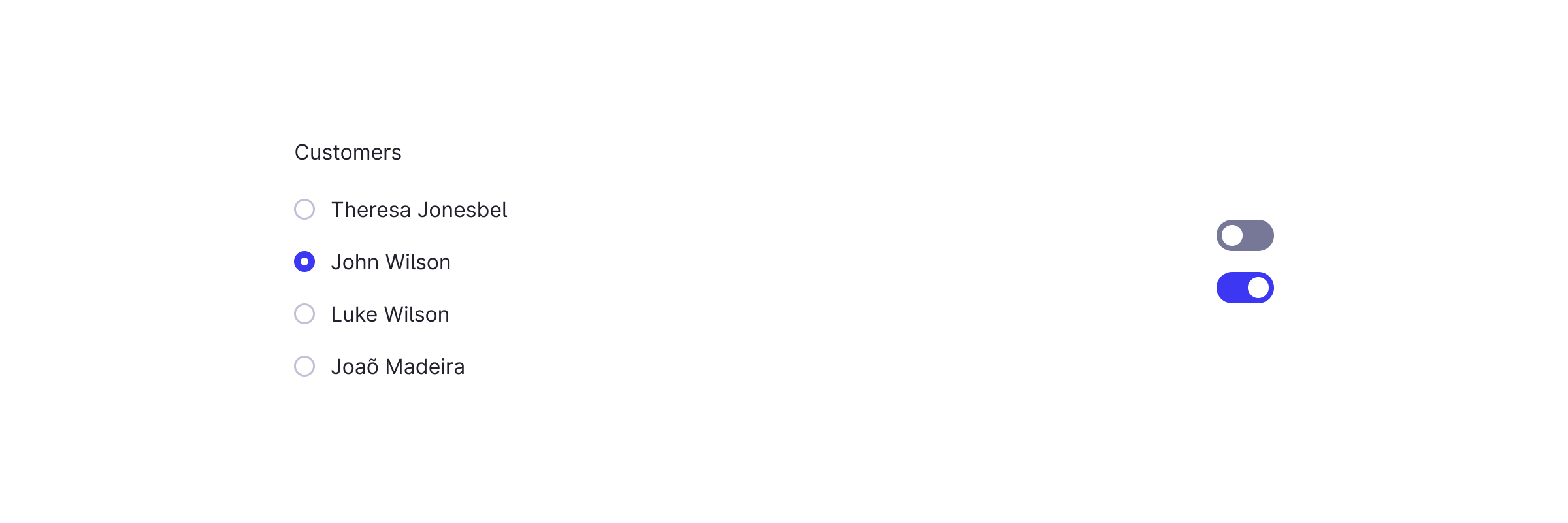 Radio buttons and toggles are alternative selection controls that can be used to enter decisions or declare preferences such as settings or dialogs.